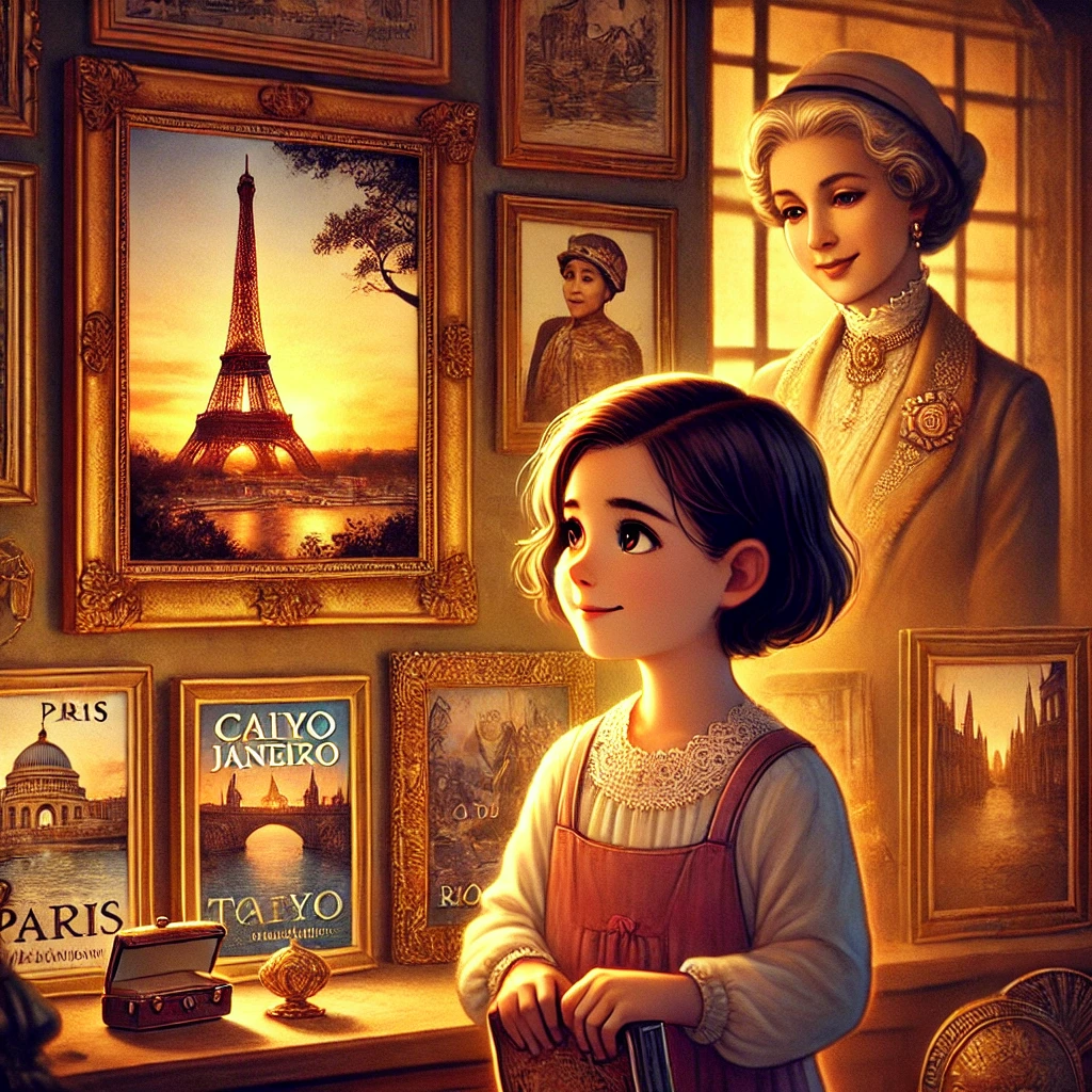 Em uma tarde de outono, enquanto as crianças dormiam, Emília parou diante de uma fotografia especial. Era uma imagem da Torre Eiffel ao entardecer, com uma luz dourada iluminando o monumento e o céu pintado de laranja e rosa. Ela ficou fascinada, sentindo-se quase transportada para aquele lugar. A dona da casa a observou em silêncio e, com um sorriso leve, aproximou-se.