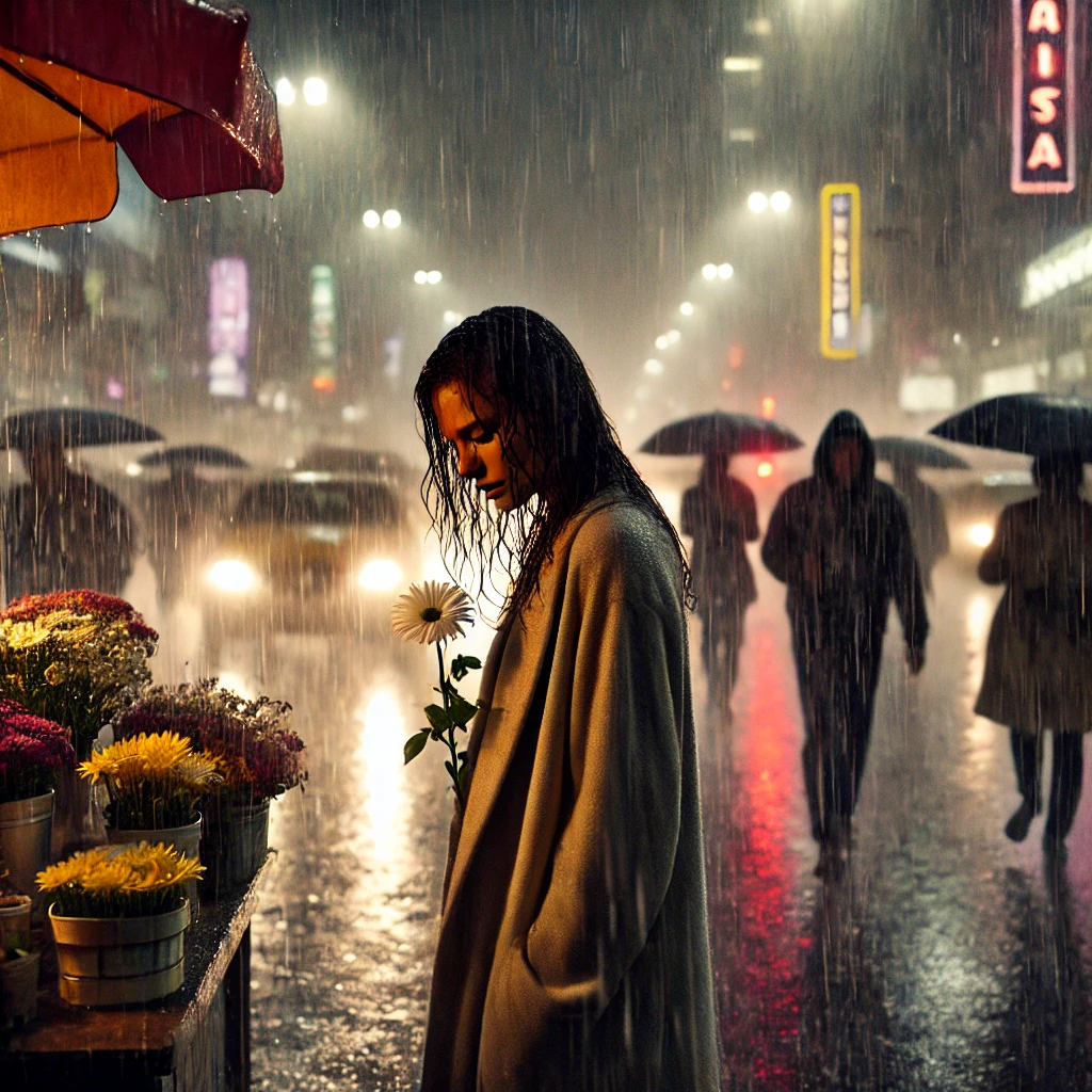 De repente, ao cruzar uma esquina, ela parou. Estava diante de uma pequena banca de flores. Um vendedor ajeitava buquês sob um toldo que mal protegia da chuva. Os olhos de Júlia foram atraídos por uma flor solitária, uma margarida branca, que parecia resistir ao peso das gotas. De algum modo, a imagem daquela flor solitária, tão simples e firme na tempestade, tocou algo dentro dela. Era como se dissesse: “Mesmo sob a chuva, ainda estou aqui.”